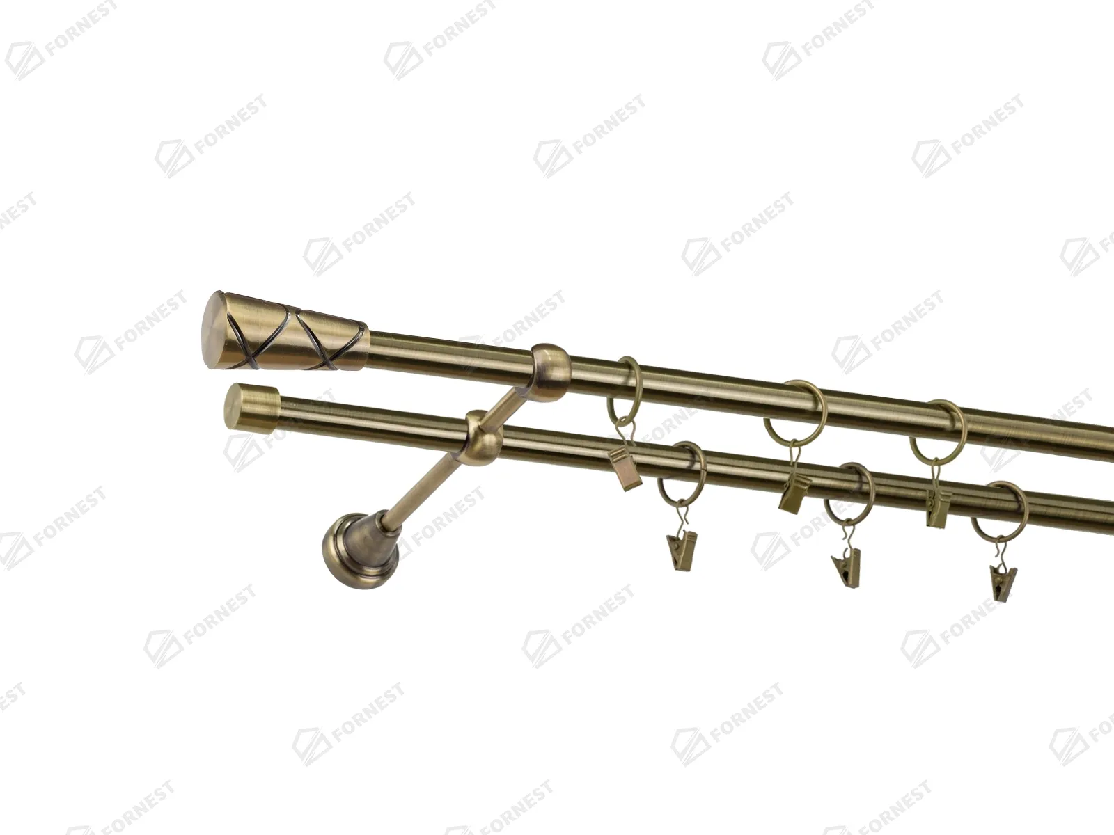 Dvojradová garniža s povrchovou úpravou - odtieň antik (matné zlato). Celokovové garniže s kvalitnou povrchovou úpravou - galvanické pokovovanie. Galvanické pokovovanie zabezpečuje vyššiu povrchovú tvrdosť, zvýšenú dolnosť voči poškriabaniu, hladký povrch. Dodávané sú v kompletoch.