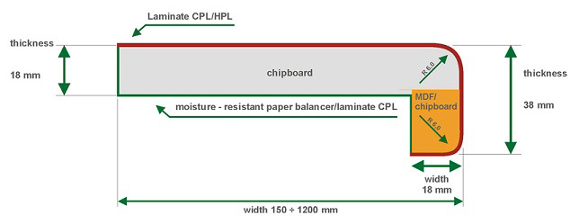 - Povrch dosky je potiahnutý HPL laminátom o sile 0,8 mm a spodná vrstva je opatrená protiťahovou fóliou, ktorá chráni parapet pred deformačnými vplyvmi.